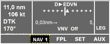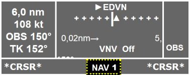 Der Cursor blinkt, und es kann mit der beschriebenen Methode die Kennung (EDVN, mit Außen- und Innenknopf) eingegeben werden. Nach Bestätigung mit der ENT-Taste erscheint zuerst die WPT-Seite mit dem gewählten WPT und den spezifischen Stationsangaben (keine Abbildung). Wird jetzt nochmals mit der ENT-Taste bestätigt, erscheint die NAV 1- Seite Abb. 35 mit dem jetzt aktiven WPT ‚EDVN’.