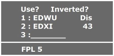 b) eines nummerierten Flugplans aus der Flugplanliste: Mit dem Außen- und Innenknopf (wie zuvor) den gewünschten Flugplan auswählen (die Anzeige ist der Abb. 27 ähnlich). Nach Drücken der CRSR-Taste erscheint der CRSR sofort über ‚Use?’, so dass nur noch mit der ENT-Taste bestätigt werden muss.